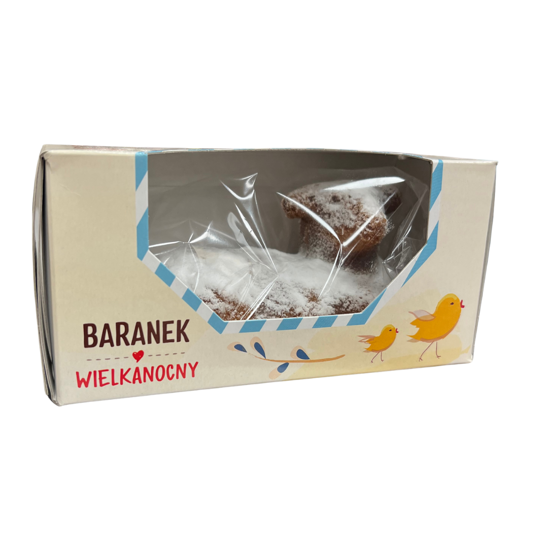 Adorable mini Easter lamb cake, a cherished Polish tradition. This delicate 120g pastry features a tender, moist sponge cake shaped like a lamb and dusted with powdered sugar for a festive finish. Perfect for individual servings or as a charming addition to your Easter table. A nostalgic treat that brings authentic Polish Easter celebrations to your home.